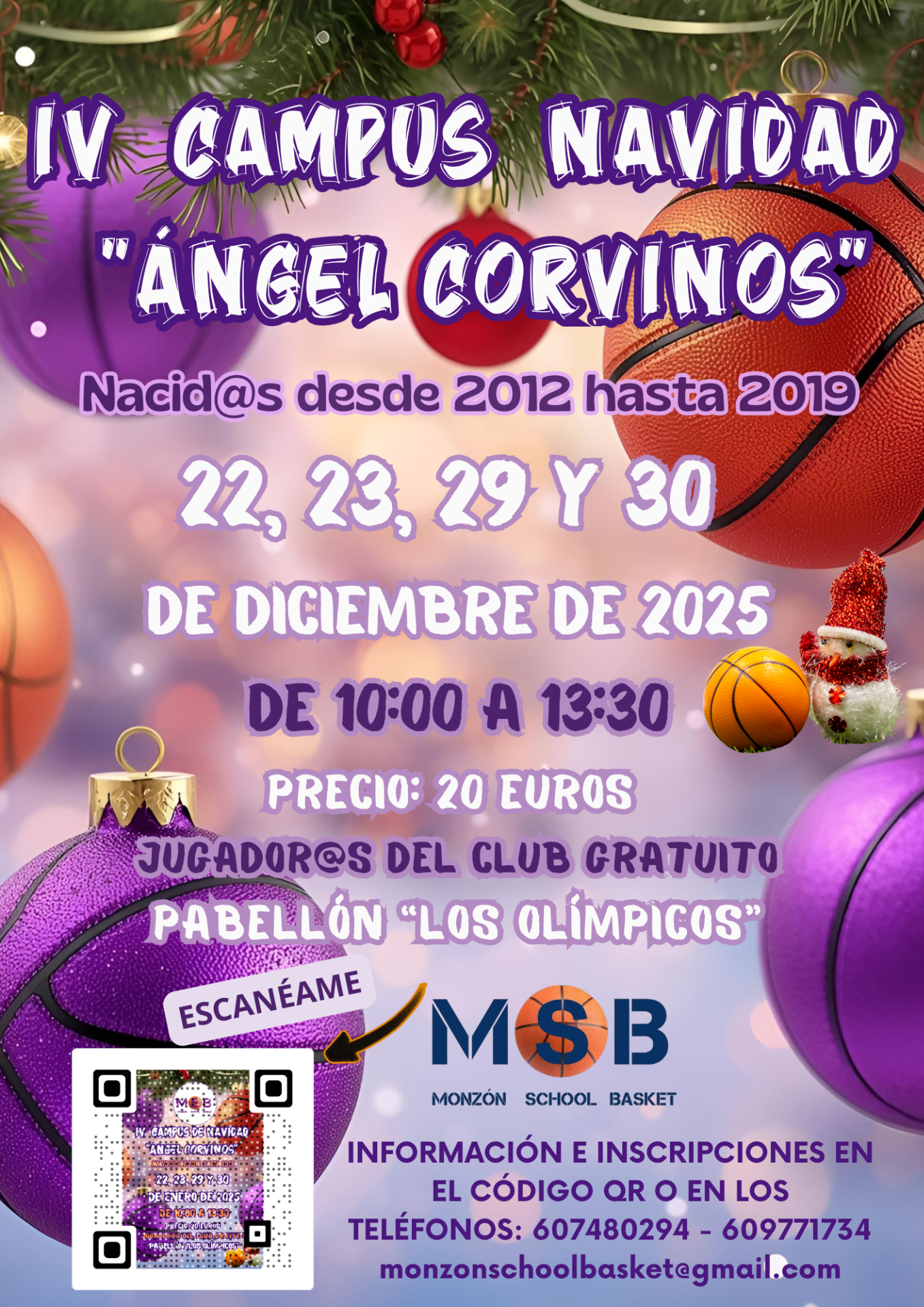 Estas Navidades volvemos con el II campus de Navidad "Ángel Corvinos". Tendrá lugar del 2 al 5 de enero de 2024 en el pabellón "los Olímpicos" (no en el Saludas como era inicialmente), en horario de 9:30 a 13:30. Habrá horario de acogida de 9:00 a9:30 y de 13:30 a 14:00, con un suplemento de 10 euros.